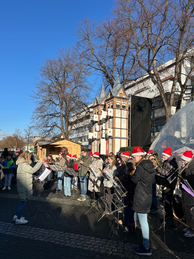 Am 11. Dezember 2025 sorgten die Bläserklassen 5b und 6b sowie das Schulorchester auf dem Knuspermarkt in Neuwied für eine festliche Stimmung. Mit weihnachtlichen Klängen stimmten sie zahlreiche Besucherinnen und Besucher auf die bevorstehende Weihnachtszeit ein. Passend zu diesem besonderen Anlass zeigte sich sogar die Sonne und viele Zuhörende versammelten sich vor der musizierenden Gruppe.
