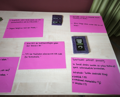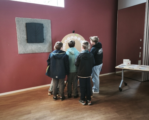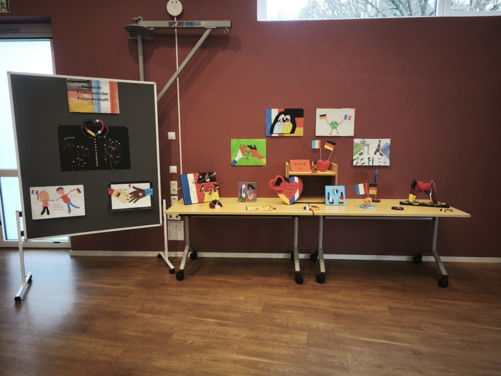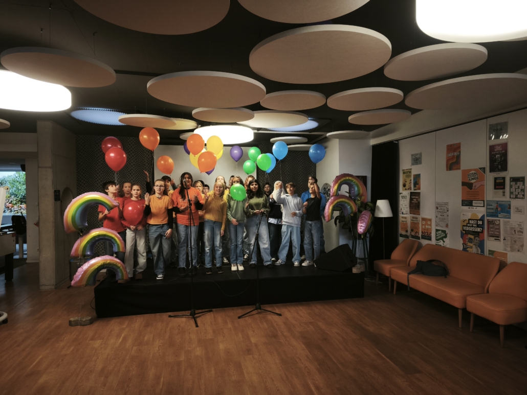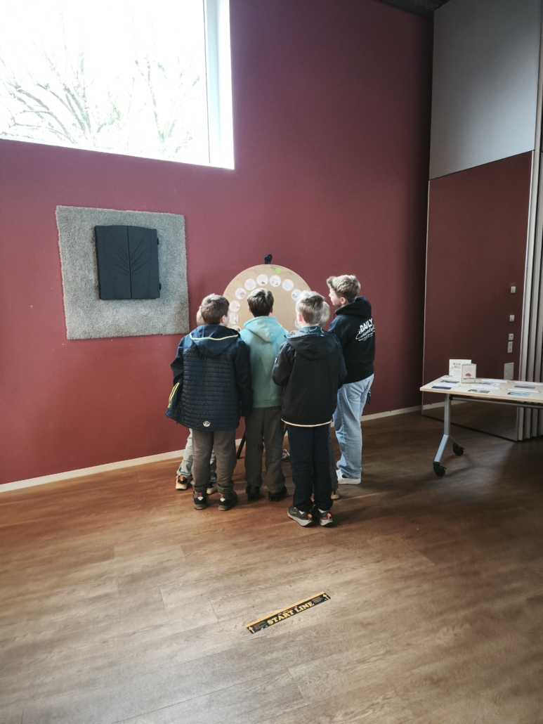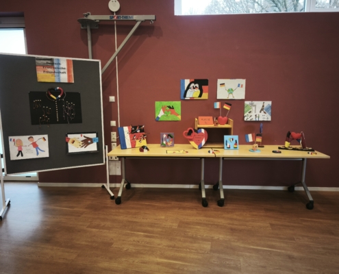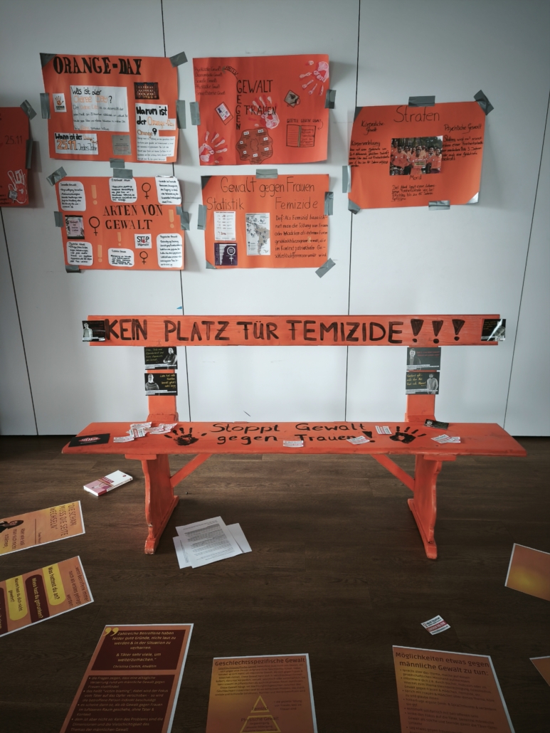 Im Anschluss an die gelungene Eröffnungsfeier konnten die Gäste und Klassen die dazugehörige Ausstellung besuchen, die noch bis zum 21. November zugänglich ist. Die diesjährige Ausstellung präsentierte eine beeindruckende Vielfalt an Schülerprojekten aus den Bereichen Unterricht und Arbeitsgemeinschaften. Frau Achilles wird interessierte Schülergruppen wie gewohnt durch die interaktive Ausstellung führen. Dabei gab es viel zu entdecken: Beispielsweise stellte die Klasse 8c Kunstwerke zur Deutsch-Französischen Freundschaft vor. Besondere Aufmerksamkeit zog eine orangene Bank auf sich, die eine THuK-Gruppe gemeinsam mit dem Big House gestaltet hatte, um auf Femizide hinzuweisen – eine bewusste Verbindung zum Orange Day der Vereinten Nationen, die ein starkes Zeichen gegen geschlechtsspezifische Gewalt setzt. Zentrale Themen der Führungen sind unter anderem Kinderrechte und eine tiefgehende Auseinandersetzung mit Fake News in Sozialen Medien. Als Novum in diesem Jahr sind zusätzlich Workshops für Schulklassen im Angebot, darunter Angebote der VHS zum Thema „Integration durch Sprache“ sowie eine Einheit der Polizei, die ihre zentrale Rolle in der Demokratie erläuterte.