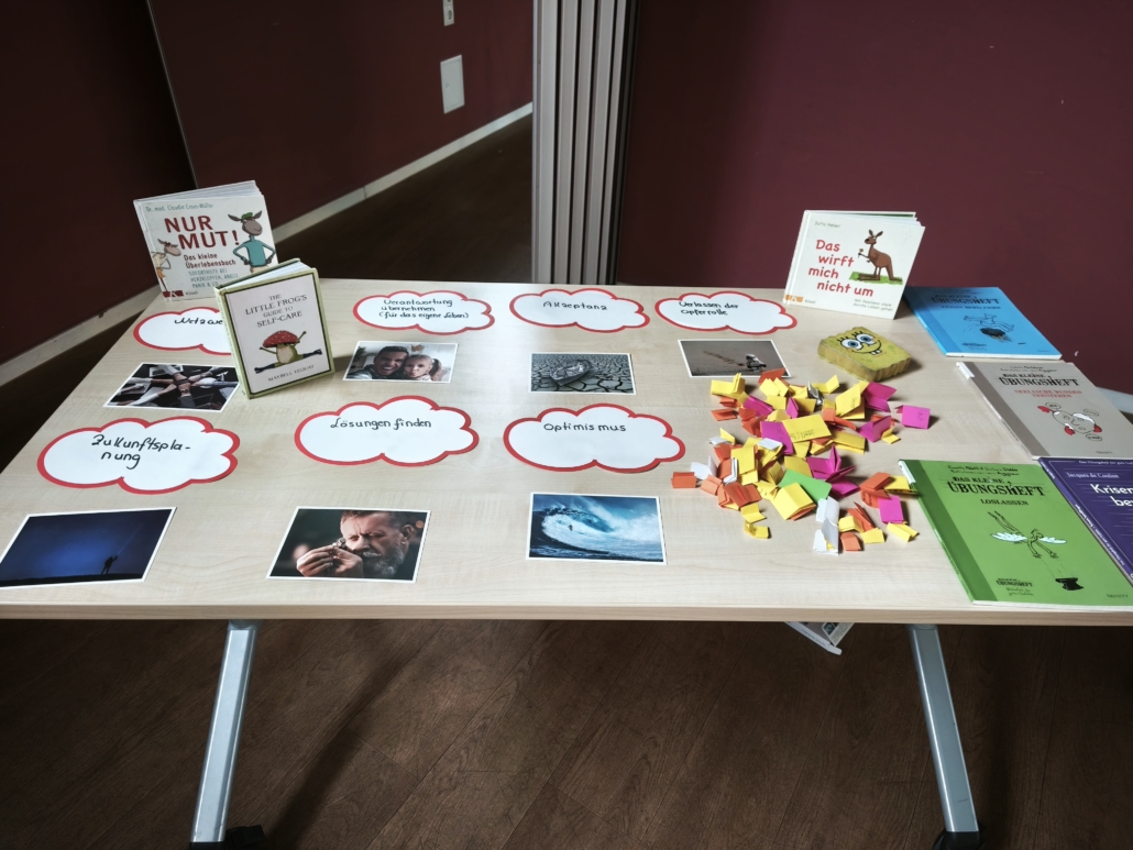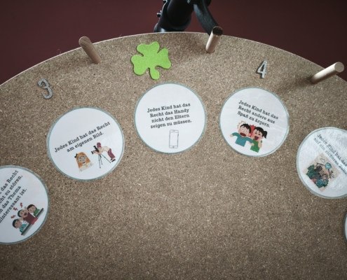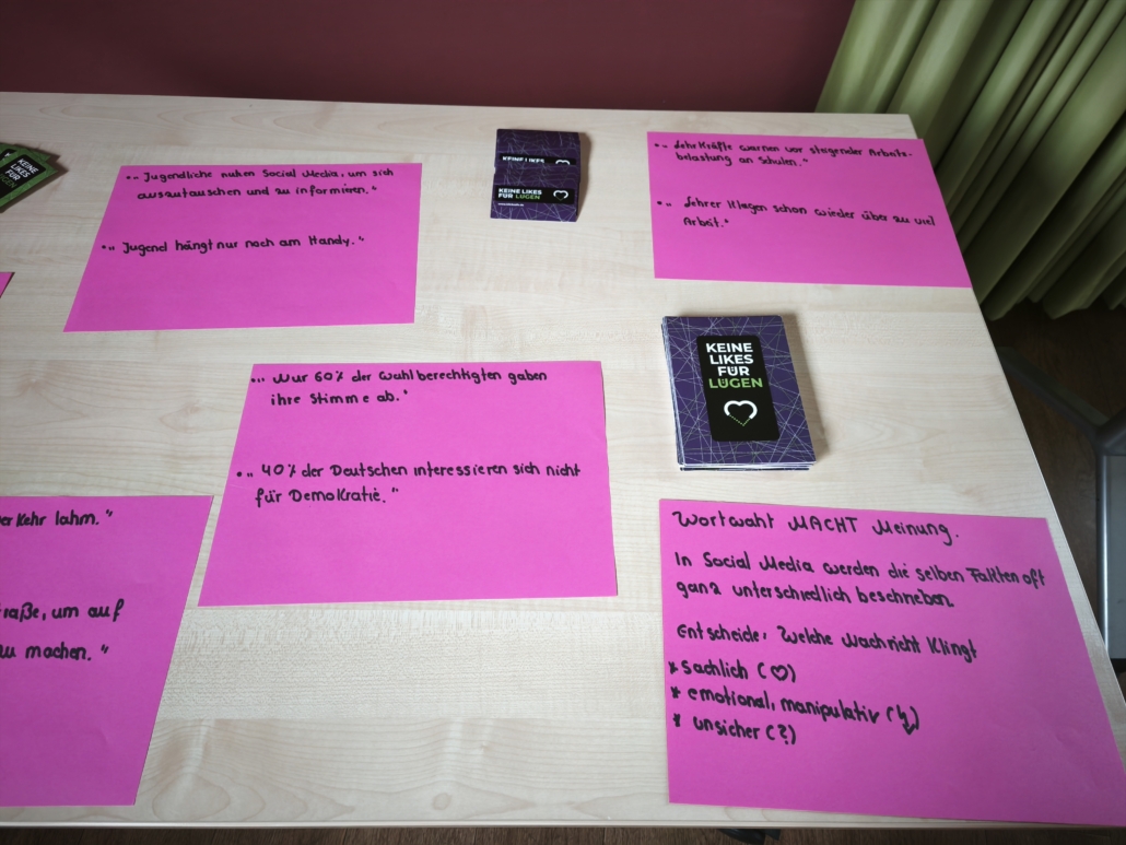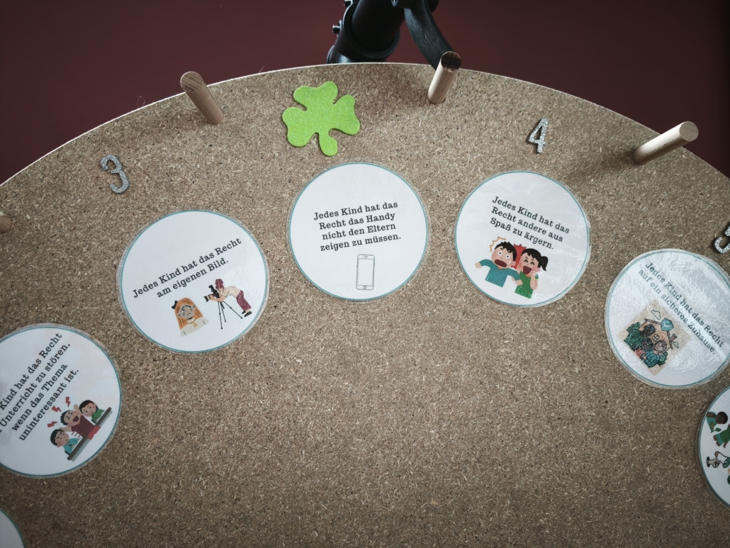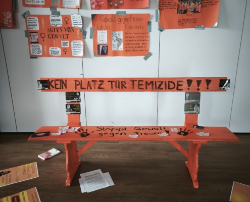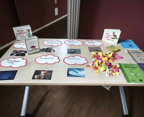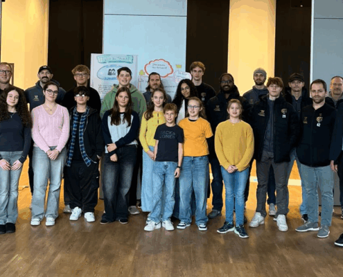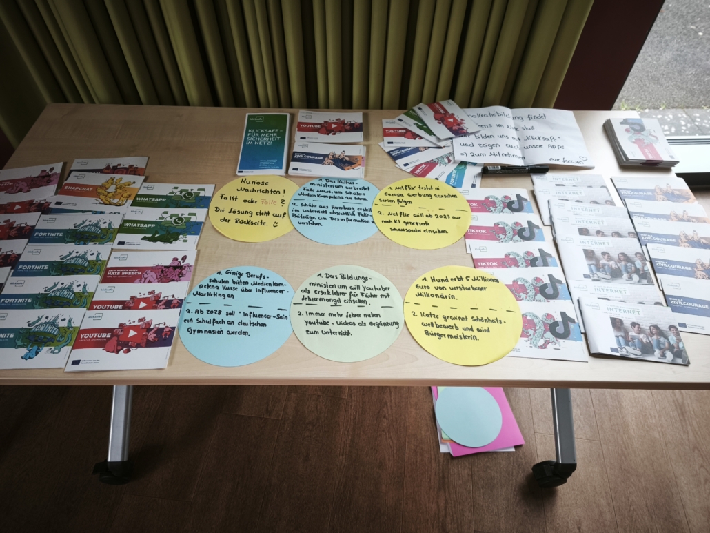 Im Anschluss an die gelungene Eröffnungsfeier konnten die Gäste und Klassen die dazugehörige Ausstellung besuchen, die noch bis zum 21. November zugänglich ist. Die diesjährige Ausstellung präsentierte eine beeindruckende Vielfalt an Schülerprojekten aus den Bereichen Unterricht und Arbeitsgemeinschaften. Frau Achilles wird interessierte Schülergruppen wie gewohnt durch die interaktive Ausstellung führen. Dabei gab es viel zu entdecken: Beispielsweise stellte die Klasse 8c Kunstwerke zur Deutsch-Französischen Freundschaft vor. Besondere Aufmerksamkeit zog eine orangene Bank auf sich, die eine THuK-Gruppe gemeinsam mit dem Big House gestaltet hatte, um auf Femizide hinzuweisen – eine bewusste Verbindung zum Orange Day der Vereinten Nationen, die ein starkes Zeichen gegen geschlechtsspezifische Gewalt setzt. Zentrale Themen der Führungen sind unter anderem Kinderrechte und eine tiefgehende Auseinandersetzung mit Fake News in Sozialen Medien. Als Novum in diesem Jahr sind zusätzlich Workshops für Schulklassen im Angebot, darunter Angebote der VHS zum Thema „Integration durch Sprache“ sowie eine Einheit der Polizei, die ihre zentrale Rolle in der Demokratie erläuterte.