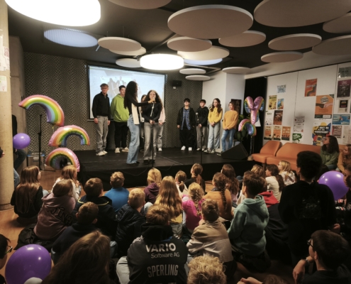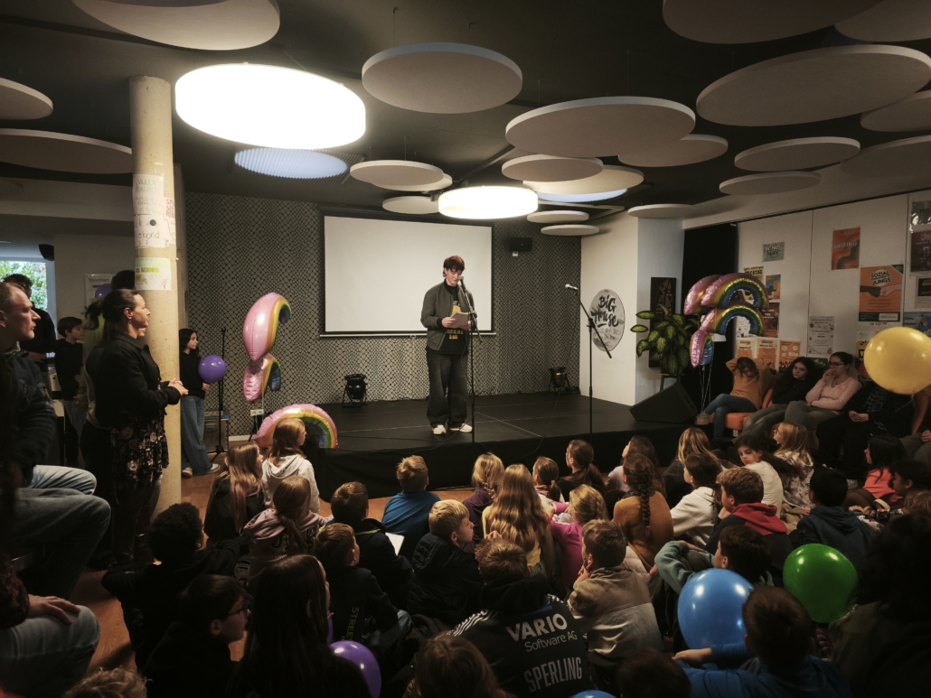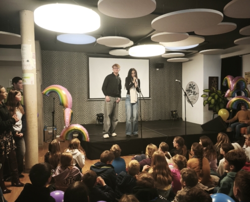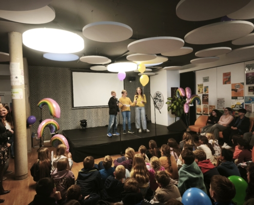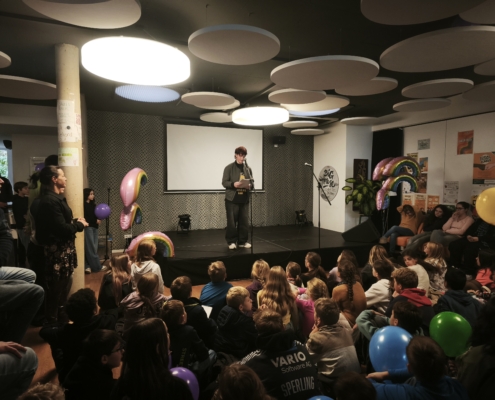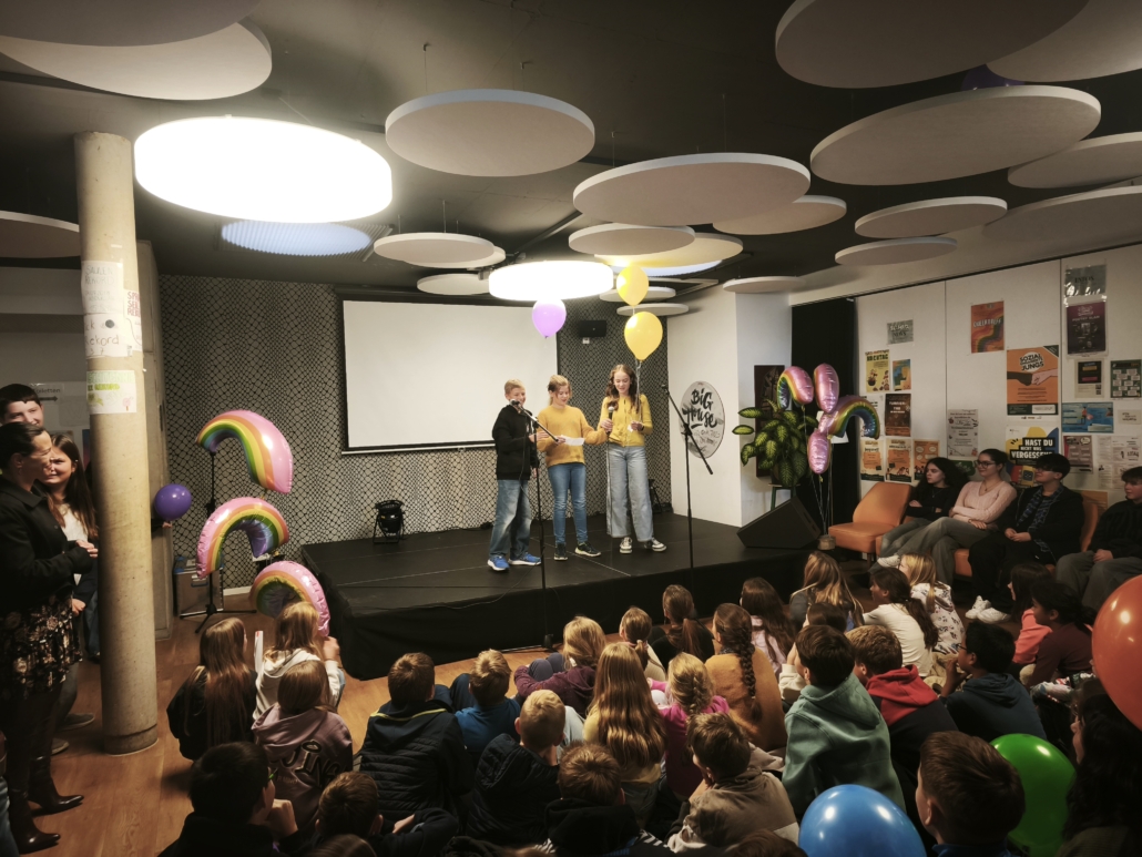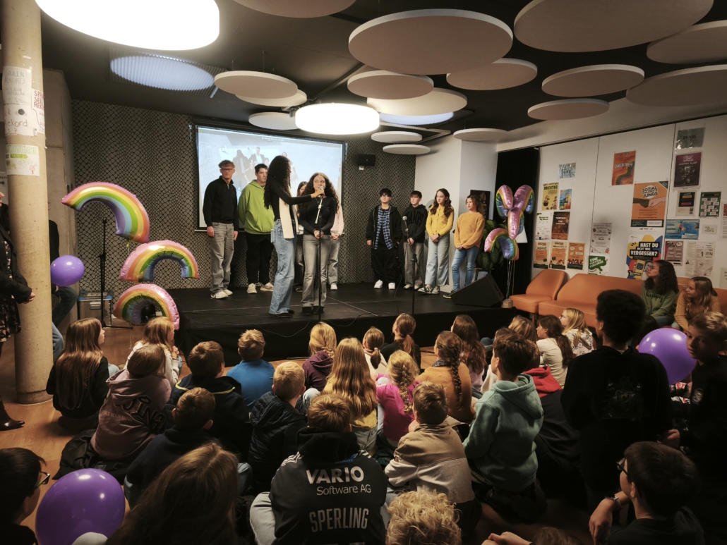 Die feierliche Eröffnung wurde maßgeblich von den engagierten Löwen mit Courage gestaltet. Dominik Wobbe und Laura Mallmann führten souverän durch das Programm. Die Löwen stellten ihre wertvolle Arbeit für Zivilcourage in einem Filmbeitrag vor und erklärte, weshalb ihnen die Mitarbeit in dieser Gruppe so wichtig ist. Für die musikalische Untermalung sorgte die Klasse 6a, die einen selbst geschriebenen und einstudierten Demokratie-Rap präsentierte. Die Klasse 8c überzeugte mit einem nachdenklichen Demokratie-Dialog. Für besondere Wortbeiträge sorgten die Poetry Slammer Claas und Lias (Carmen-Silva-Schule). Ebenfalls bemerkenswert war die Aufführung des DS-Kurses 13, der das Thema Femizid aufgriff und in einem dokumentarischen Theaterstück inszenierte.
