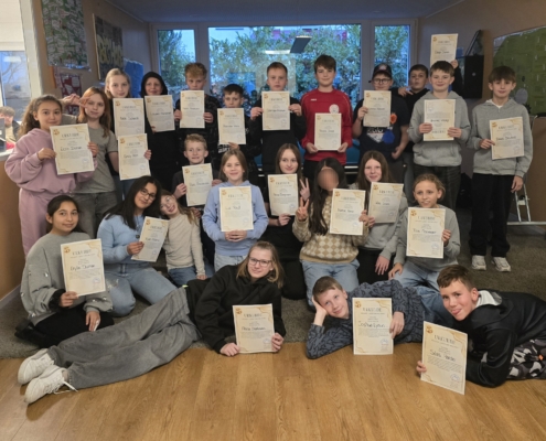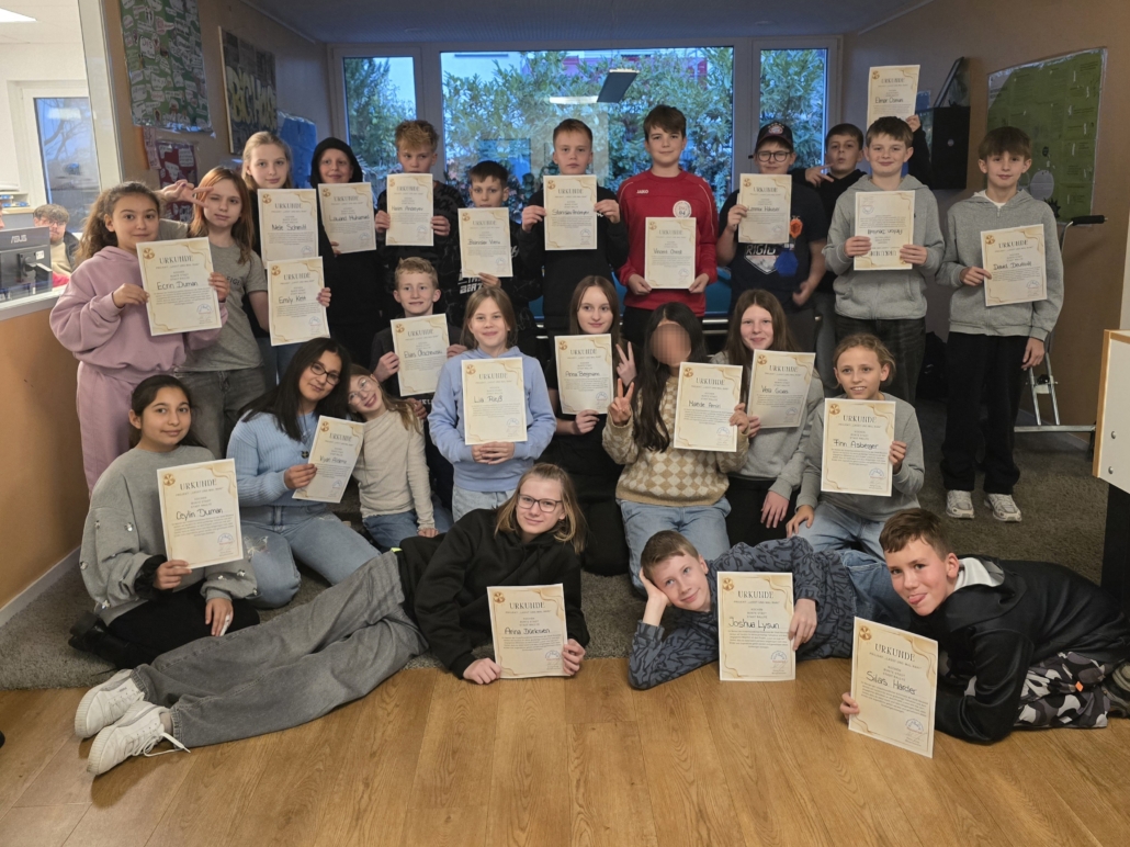 Ein besonderes Highlight war die feierliche Übergabe der Urkunden: Der Bürgermeister der Stadt Neuwied hatte es sich nicht nehmen lassen, alle Urkunden persönlich zu unterschreiben, um die Bedeutung des Engagements der Schülerinnen und Schüler ausdrücklich zu unterstreichen. Die Freude darüber war groß – nicht nur, weil die Urkunden ein sichtbares Zeichen der Anerkennung sind, sondern auch, weil die Klasse spürte, dass sie mit ihren Beiträgen Teil einer größeren, wichtigen Sache war. Die Projekte entstanden nach dem Prinzip „von Kindern für Kinder“ und machten erfahrbar, wie demokratische Mitgestaltung konkret aussehen kann. Die Auszeichnung zeigt, welchen Beitrag unsere Klasse im Rahmen einer kinderfreundlichen Stadt leisten konnte.