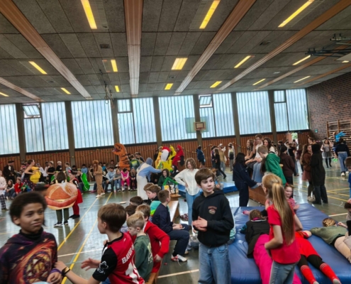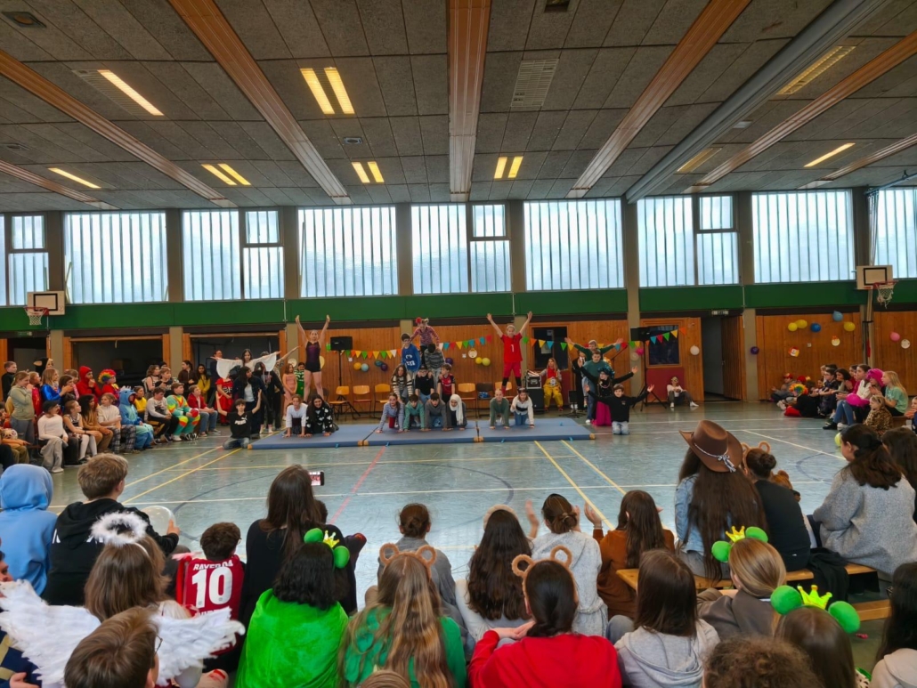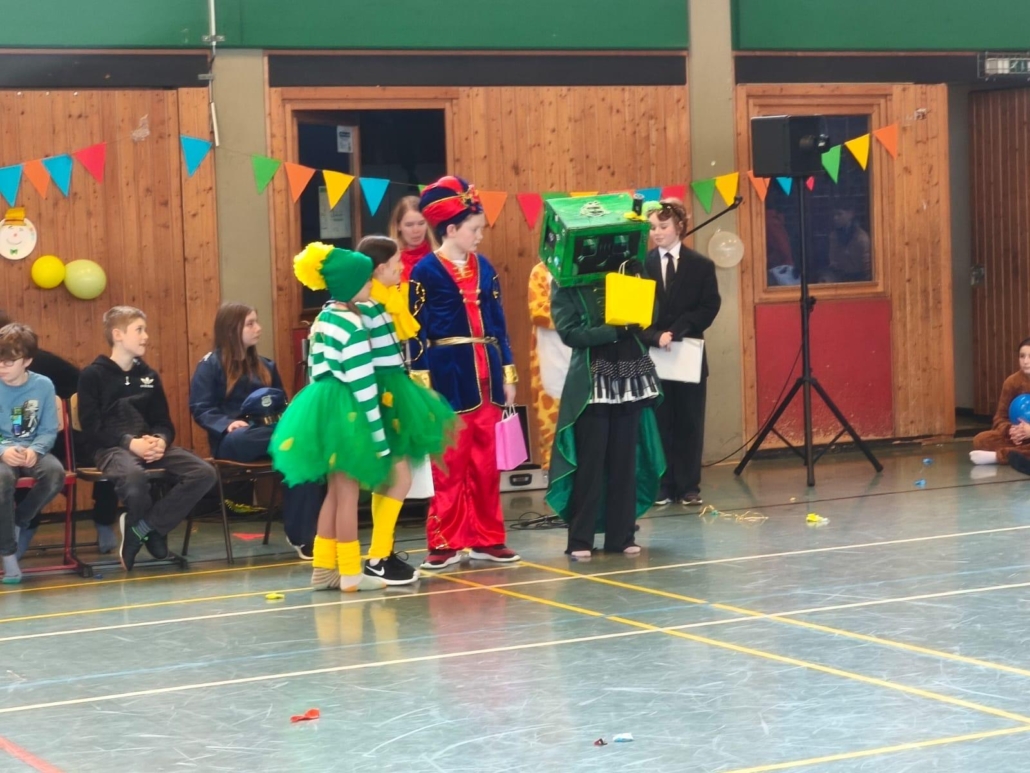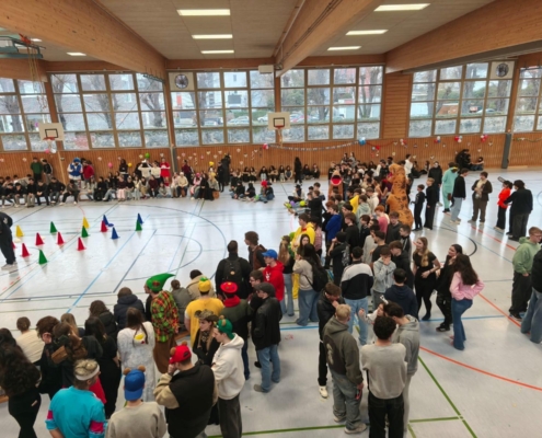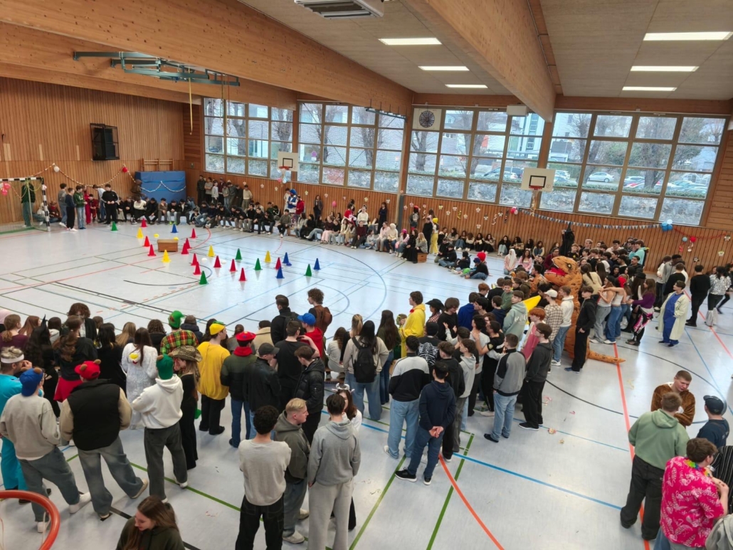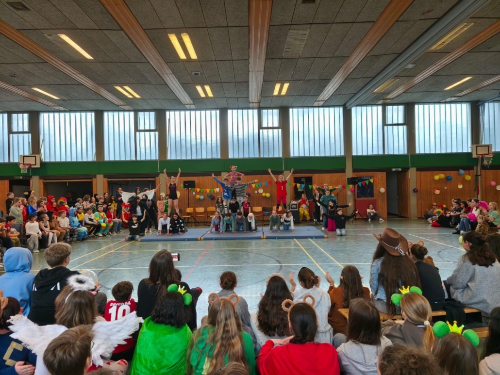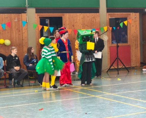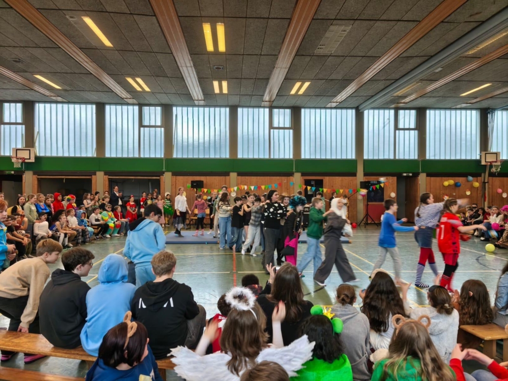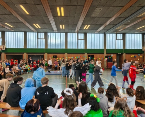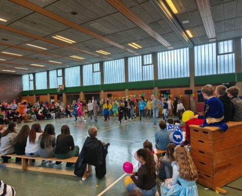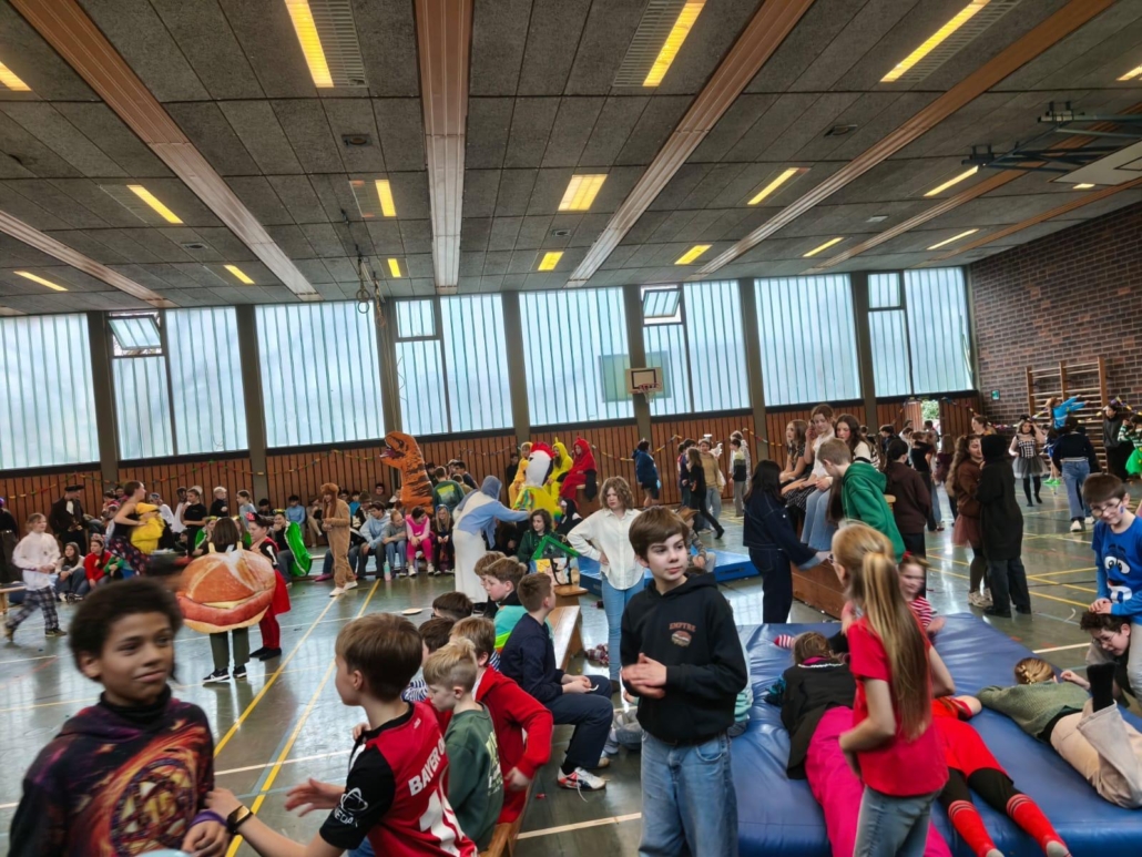 traditionell feiern die Schülerinnen und Schüler gemeinsam mit den Lehrkräften den Beginn des Straßenkarnevals. Die Klassen 5-7 in Halle Gelb, die Klassen 8-10 in Halle Rot. neben Musik, Tanzvorführungen werden gemeinsam Spiele gespielt und die besten Kostüme prämiert.