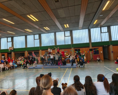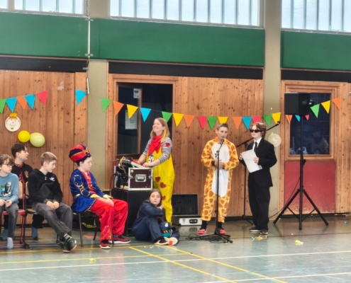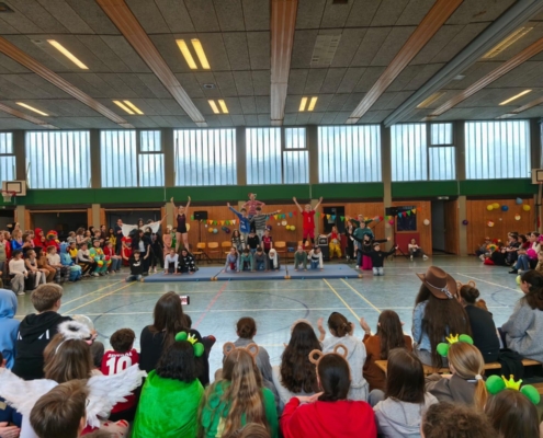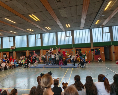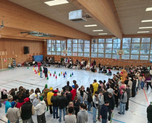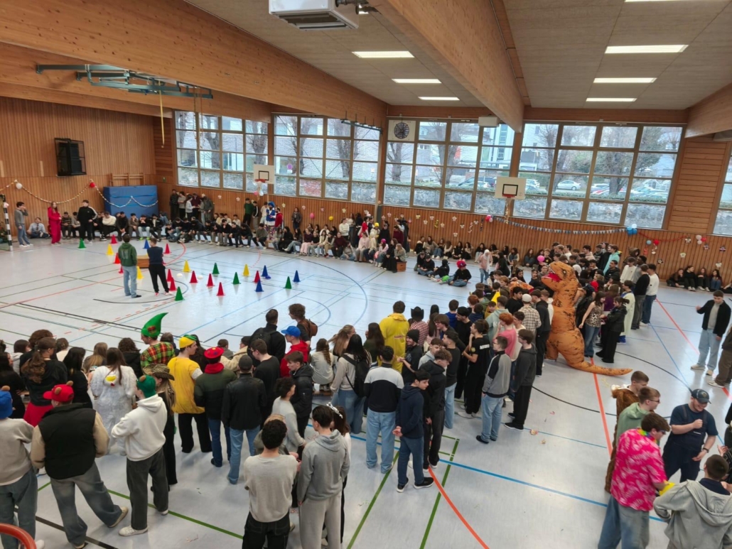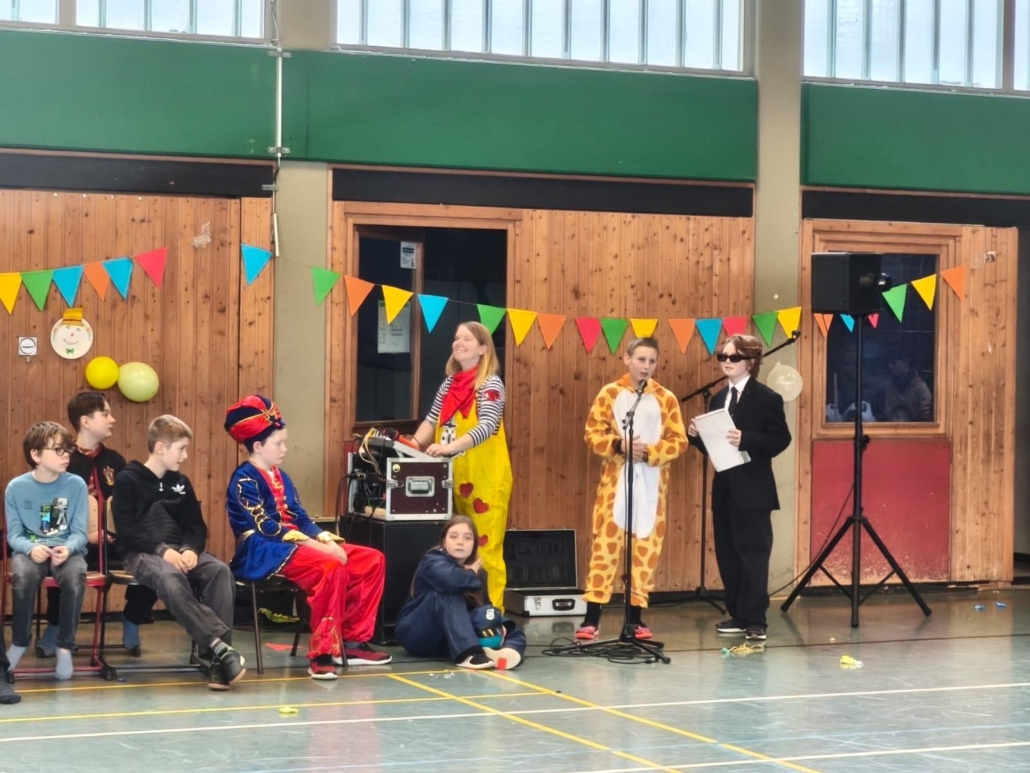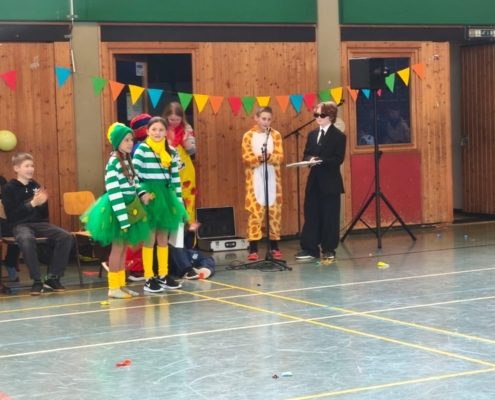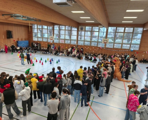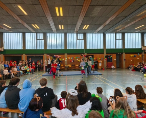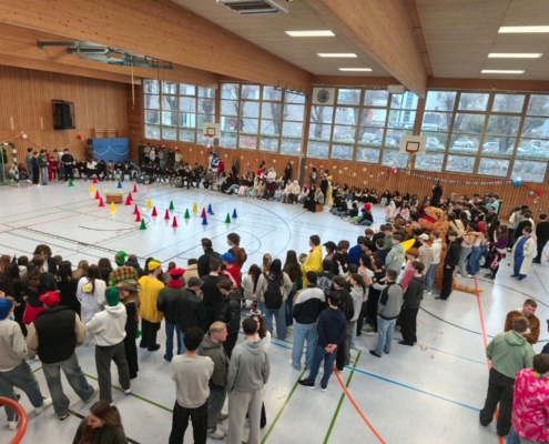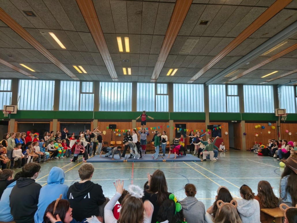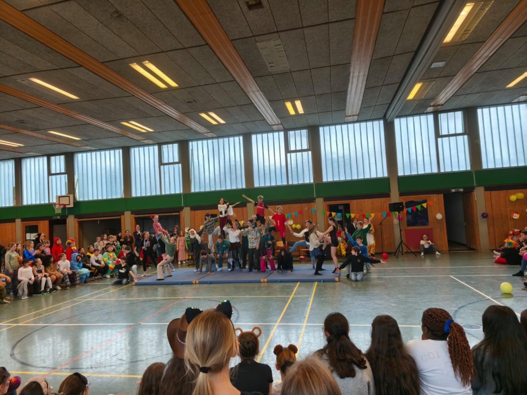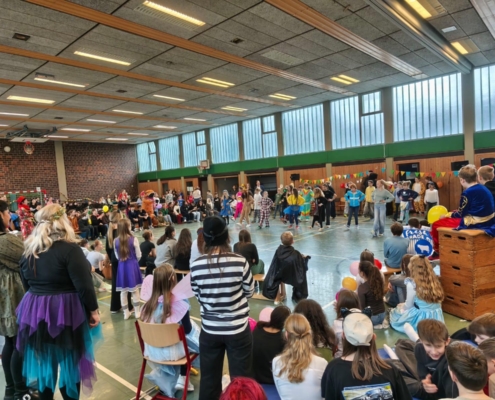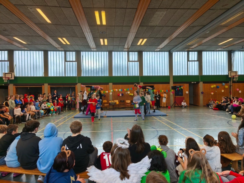 traditionell feiern die Schülerinnen und Schüler gemeinsam mit den Lehrkräften den Beginn des Straßenkarnevals. Die Klassen 5-7 in Halle Gelb, die Klassen 8-10 in Halle Rot. neben Musik, Tanzvorführungen werden gemeinsam Spiele gespielt und die besten Kostüme prämiert.