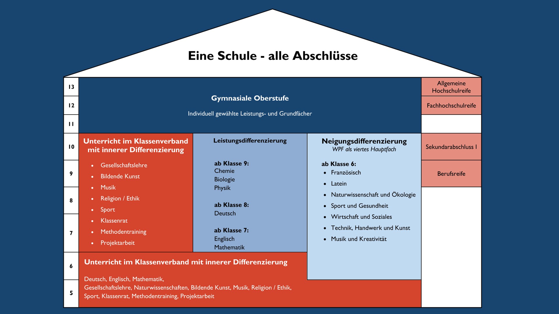 Kennzeichen des Unterrichts sind Integration und Differenzierung. Integration bedeutet, dass alle Kinder ungeachtet ihrer unterschiedlichen Lernvoraussetzungen gemeinsam im Klassenverband, der vom 5. bis zum 10. Schuljahr bestehen bleibt, unterrichtet werden. Differenzierung bedeutet, dass die Kinder entsprechend ihren unterschiedlichen Fähigkeiten und Neigungen gefördert und mit unterschiedlichen Methoden unterrichtet werden, wobei wir zwischen Fachleistungs- und Neigungsdifferenzierung unterscheiden.