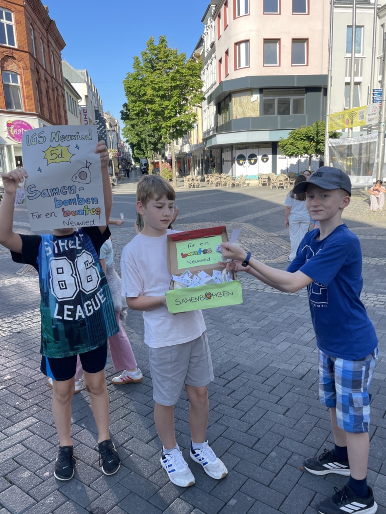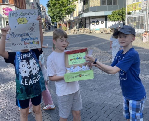 Trotz der Kurzstunden und sommerlicher Hitze ließen sich die jungen Naturliebhaber nicht bremsen, die ersten Samenbomben in der Innenstadt von Neuwied an Passanten zu verteilen – mit einem Lächeln und der Einladung, unsere Stadt ein wenig bunter zu machen.