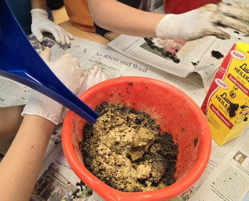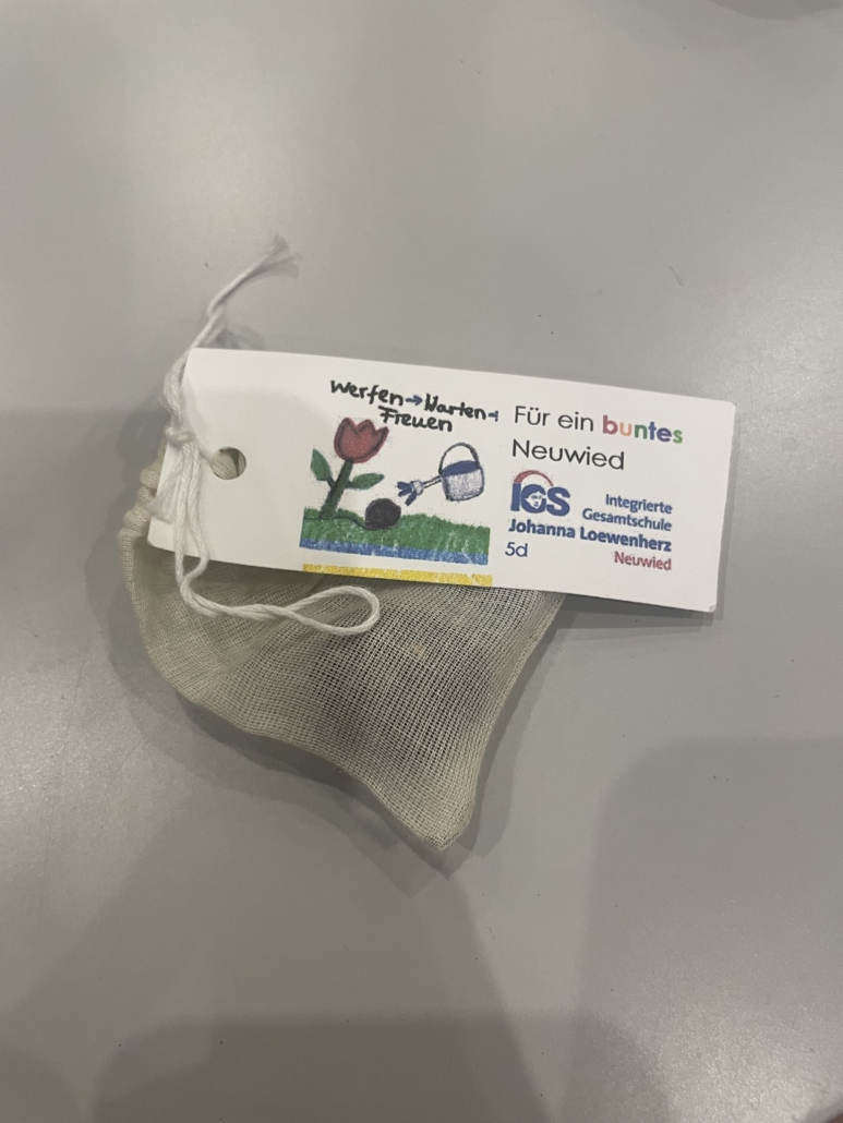 Am heißen Montag, 30.06. wurde das zweite Projekt der Klasse 5d im Rahmen von „Lasst uns mal ran!“ umgesetzt: Unter dem Motto „Samenbomben für ein buntes Neuwied“ mischten die engagierten Schülerinnen und Schüler Erde, Tonpulver und bunte Blumensamen zu kleinen Kugeln – den sogenannten Samenbomben. Ein selbstentworfener Flyer wurde gemeinsam mit unserem Schullogo zum Etikett, das an die Baumwollbeutelchen gebunden wurde, in denen die Samenbomben verpackt wurden. Wie am Fließband wurden die 200 getrockneten Kugeln so transportfähig gemacht.