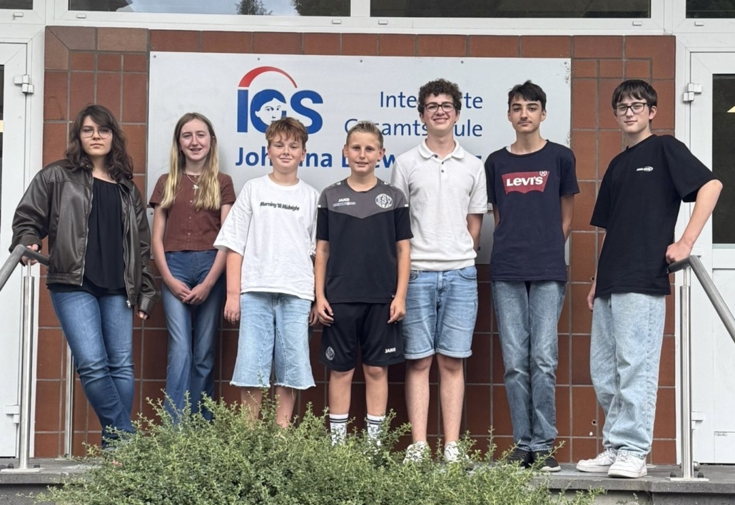 von links nach rechts: Isabelle Diener (MSS 12) (Schülersprecherin), Lina Krämer (7b), Arsenij Ratnikov (6c), Collin Braun (6c), Leander Linster (10b), Dior Elshani (10d), Emil Jakobs (10b) (stellv. Schülersprecher)